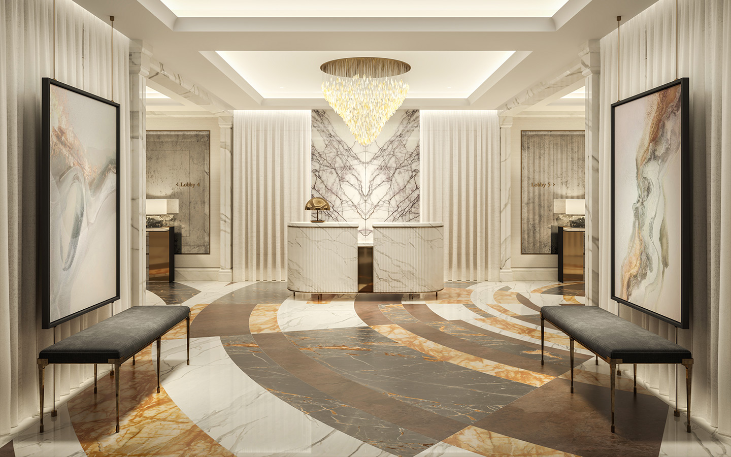 Заходя в здание, вы видите пол с радиальным орнаментом, который выложен разноцветным мрамором. В основе этой идеи — карта Москвы, имеющая радиальную структуру. Орнамент на полу расходится лучами, создавая отрезки разных цветов. Для лобби парковочного этажа мы использовали похожий дизайн, но более темных, «земляных» тонов, поскольку парковки находятся под землей. Чем выше вы поднимаетесь, тем светлее становятся цвета и оттенки.
