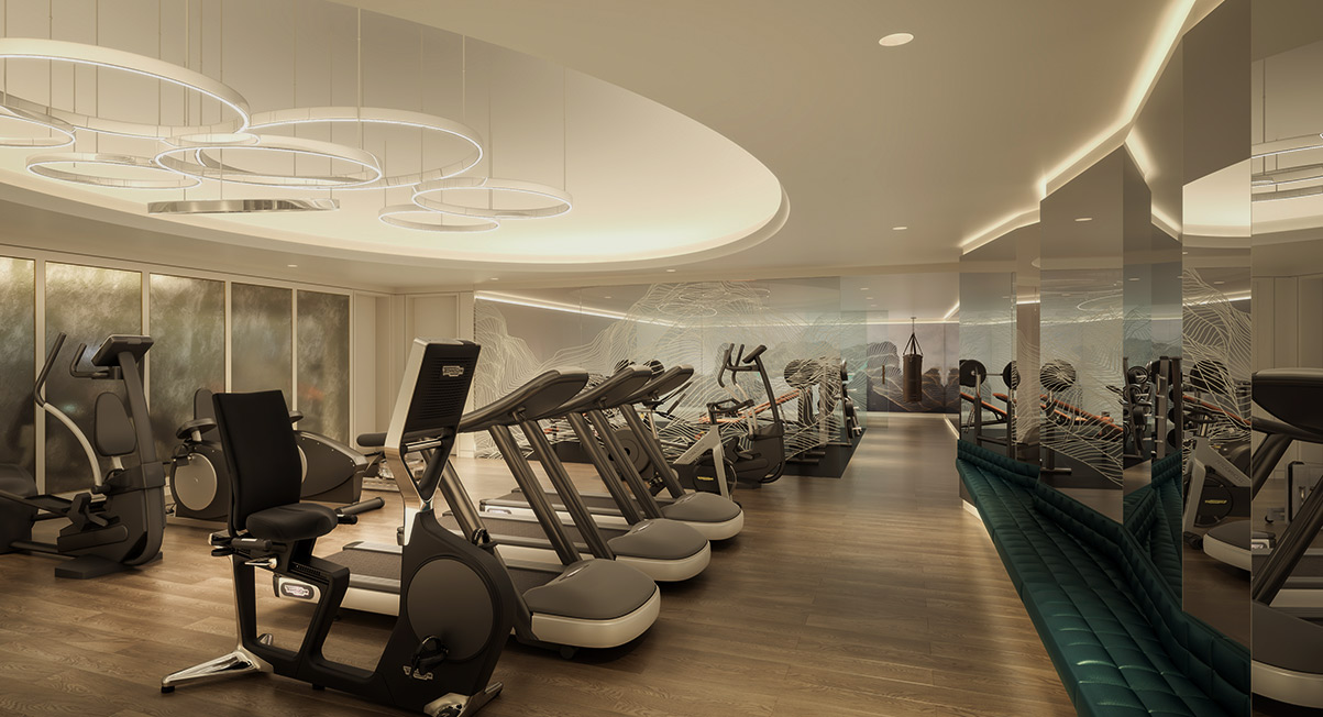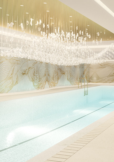 Вдоль бассейна тянется волнообразная стена с узором металлического цвета, который подсвечивается снизу и сверху — это уникальный интерьер, такого нигде больше нет. В спортзале мы сделали стеклянные панели с выгравированными узорами, тоже специально придуманные для этого здания. В бассейне формы более плавные и текучие, а в спортзале — более энергичные, и в обоих случаях используются комбинации различных материалов.