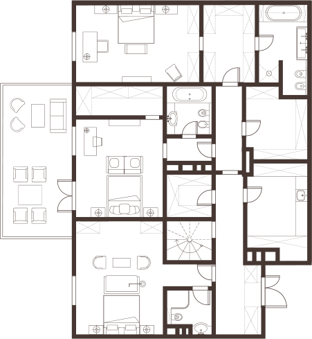 Планировки резиденций в этом доме абсолютно правильные. Одно помещение переходит в другое, как во дворцах или усадьбах. Все нанизываются на ось, это анфиладный принцип — открываются первая, вторая, третья двери, и видна вся глубина пространства.