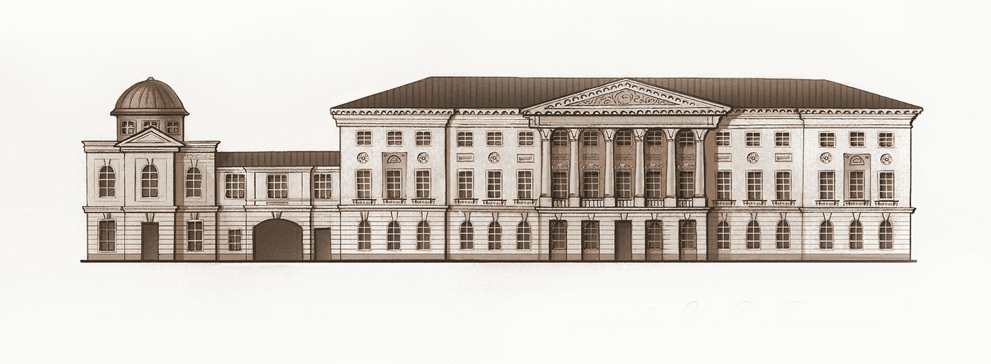 Трехэтажный дворец был украшен внушительным шестиколонным портиком, главное здание соединялось с двумя флигелями, расположенными по бокам парадного двора и крытыми галереями. Материалом построек служили оштукатуренный кирпич и известняк – самые простые материалы, ожившие в умелых руках.
